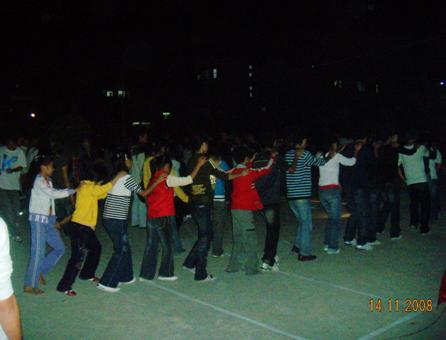 舞会有七十二步、十六步,兔子舞,恰恰舞等多种舞蹈,在这些各具特色,节奏不一的跳动中大大增强了同学之间的交流与合作,再加上舞会中间参插的小游戏更增添了许多欢声笑语。