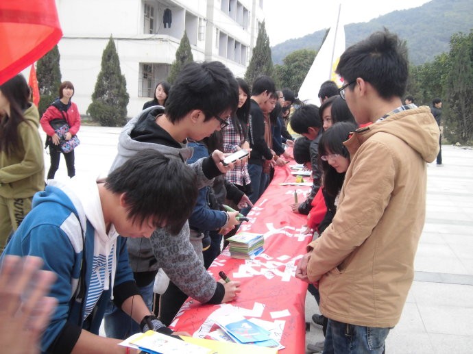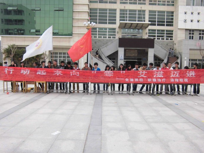 随着党的十八大胜利召开我们又迎来了今年第25世界艾滋病宣传日活动,为了进一步做好今年的宣传活动,爱心社经过精心筹备,周密安排,124日下午200-330在学院图书馆广场开展了以行动起来向艾滋迈进为主题,副标题是全面参与、全力投入、全面预防的艾滋病日宣传教育活动。活动开始,爱心社志愿者在分散广场各部,发放艾滋病知识宣传单,吸引众多同学来参与活动。活动中,爱心社志愿者为前来参加活动的同学佩戴红丝带,讲解艾滋病预防及传播知识,现场举办有奖问答、百人签名等,让大家以不同方式更深入了解艾滋病预防知识。