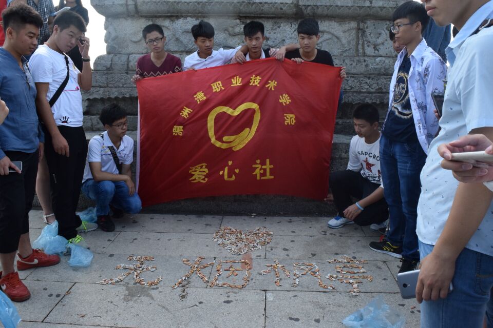 今日,我院六十多名大学生志愿者参加了本次“无烟枫亭,健康同行”的环保活动。在活动现场,志愿者们纷纷弯腰捡起地上的果皮纸屑,并且用其中的上千个烟头摆出了醒目的“无烟枫亭”四个大字。大家分工协作,积极配合,活动顺利举行。