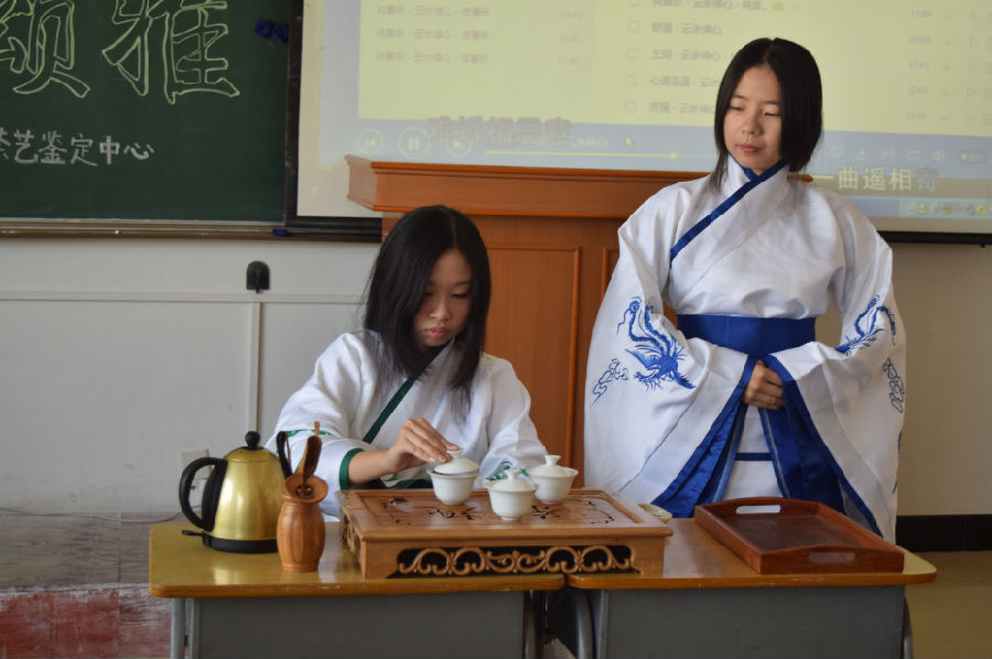 我院茶社社员身着古典着装的茶艺表演者,手托茶杯旋转闻香,举手投足皆顺应音乐的起承转合,给人以美的享受。茶艺表演者不但要熟练掌握茶叶鉴别、冲泡的水温、时间等技术问题,还要讲究整个冲泡过程中操作的艺术美感等。在交流活动中,莆田学院方芳老师为大家讲解各种茶的历史文化背景,开拓了大家的视野。