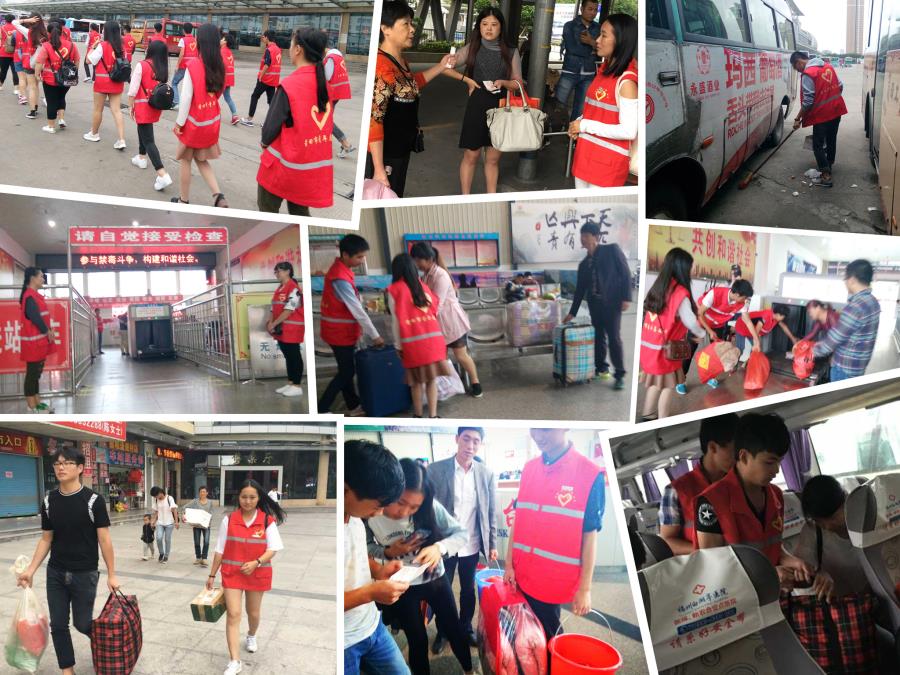 中午12点40分,30名志愿者穿上红色马甲、佩戴校徽和志愿者徽章,并详细了解活动规则和注意事项。志愿者分为五小分队,第一队负责售票大厅票务导购,引导旅客排队购票,细心协助旅客进行电子购票和自助取票,并负责文明劝导第二队负责提醒旅客过安检,帮助乘客将行李放入安检机第三队位于安检出口,负责将顺利通过安检的行李拿出,帮助乘客将行李搬到指定位置;第四队位于候车厅,主要进行文明劝导、帮老扶幼、乘车指引、卫生保洁等工作前往城乡公交运输区,维护上车秩序,进行乘车指引,协助老人儿童过马路。