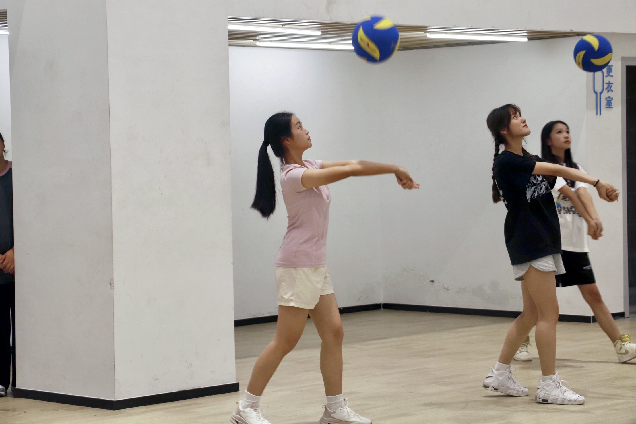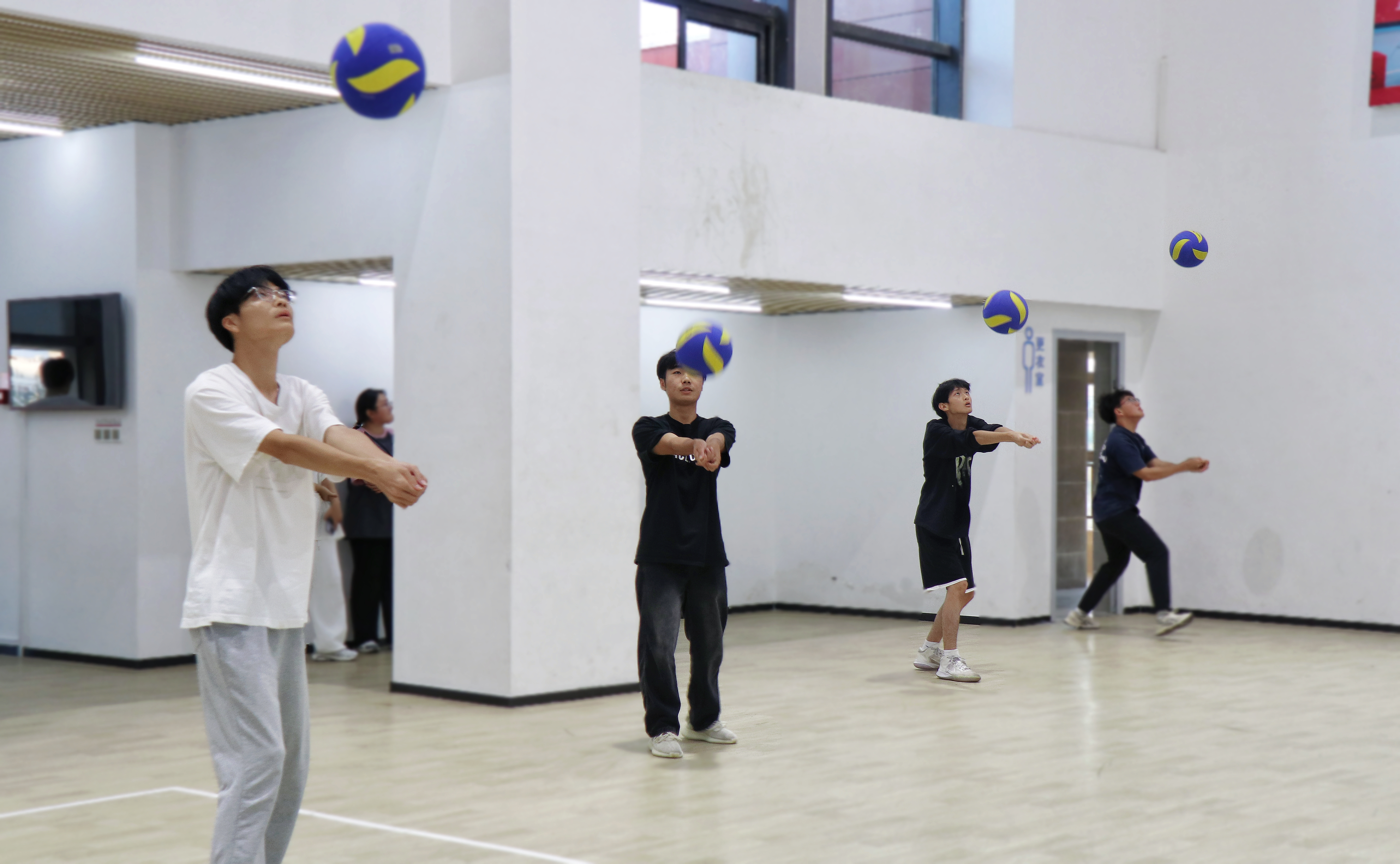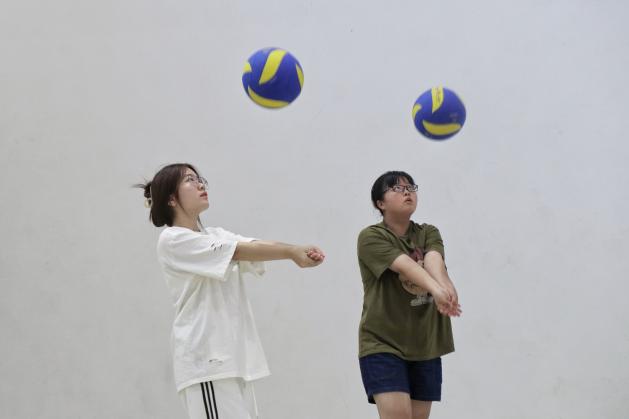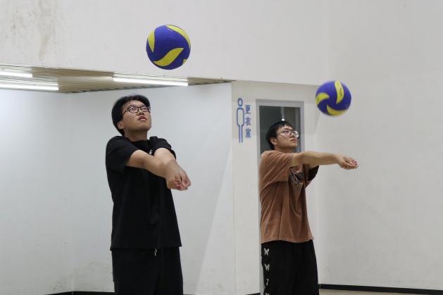 “蹲身、伸臂、压腕、抬臂、垫球“挥洒青春汗水
