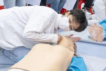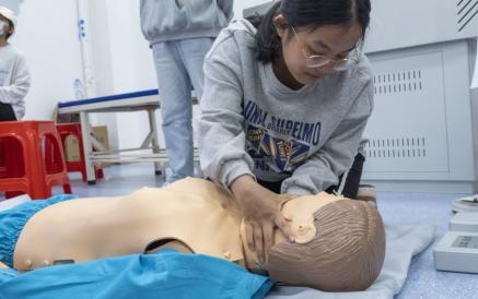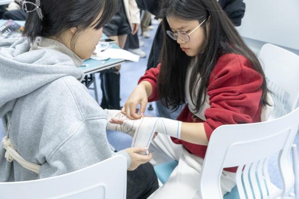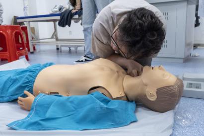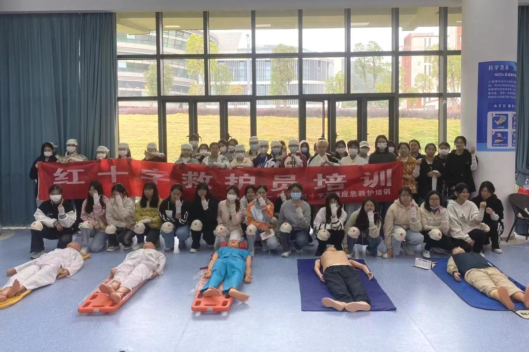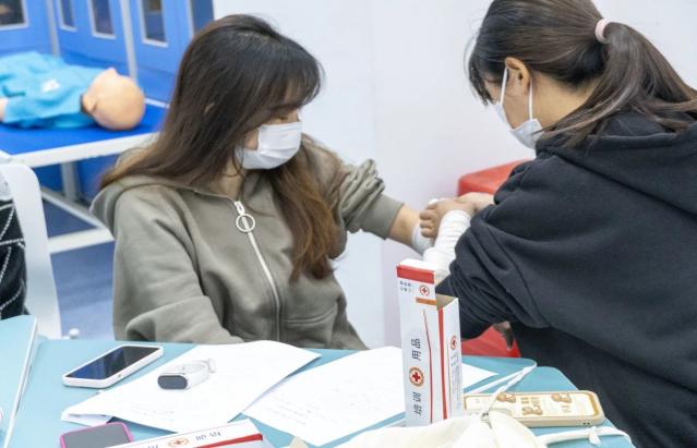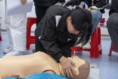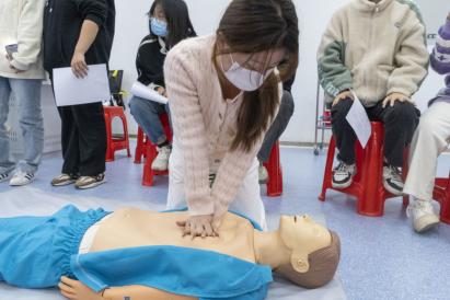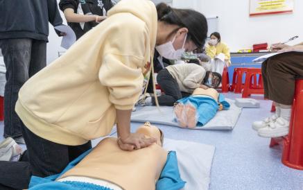 培训过程中,红十字现场救护培训中心的教师团队通过理论讲授、现场演示、实践操作等方式进行授课,结合生活事例以及通俗易懂的语言,逐一讲解了胸外按压、人工呼吸、止血、包扎等应急救护技巧,并现场实操心肺复苏的方法,向学子们普及急救知识。