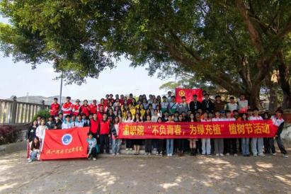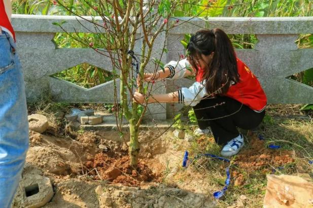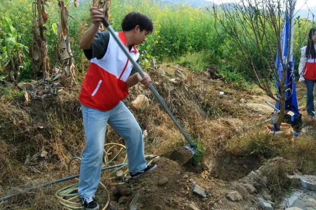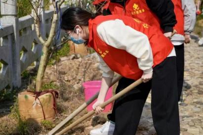 我院百余名志愿者干劲十足,男生挥锹铲土,女生提水扶苗,志愿服与新芽绿树相互映衬,青春的活力在劳动中焕发。