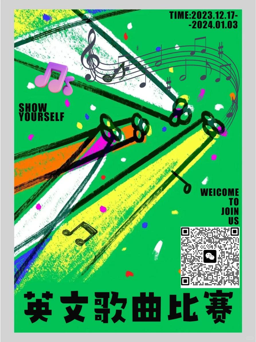 如想参加,请于2023年12月19日前扫描下面的二维码,加入英文歌唱大赛初赛的总群,入群后请及时更改自己的信息。(格式应为“姓名+班级+手机号”)