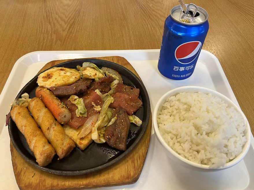 烧烤的滋味源于孜然茴香的点缀,在我们不想出校却又想着那一缕辣味之时,桂园食堂二楼的烤盘饭就成了不错的选择。