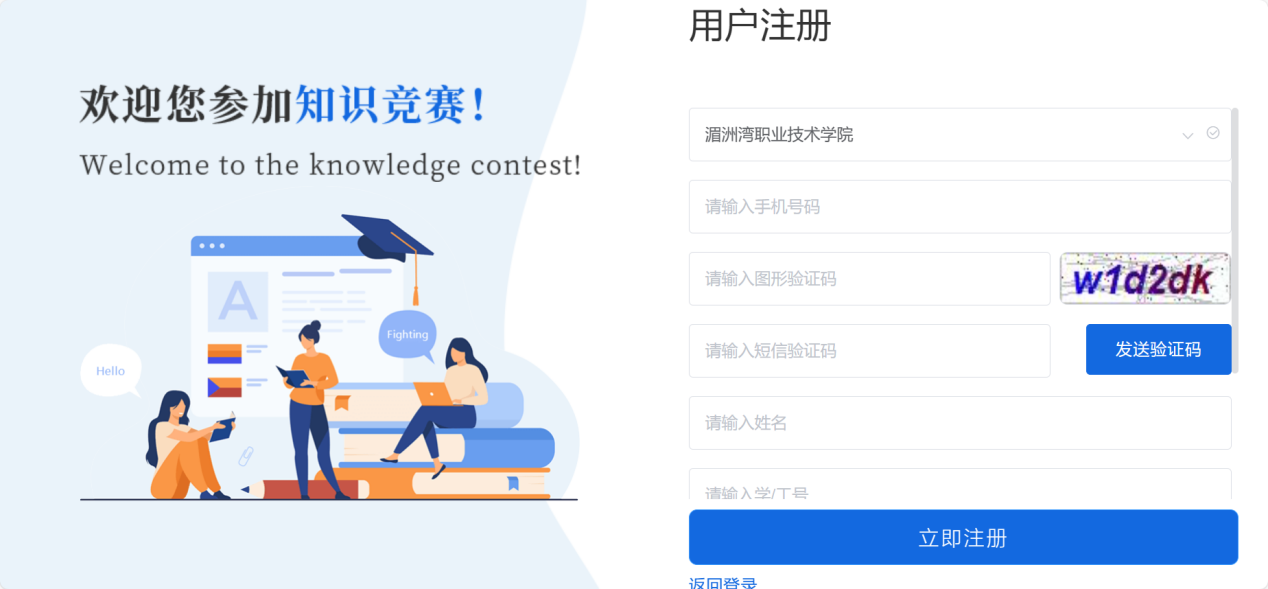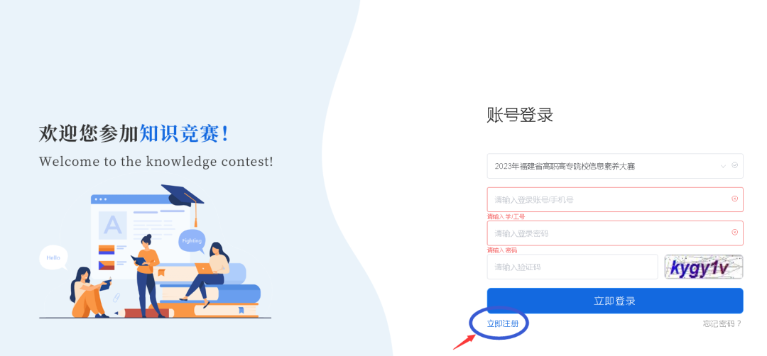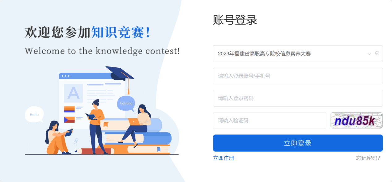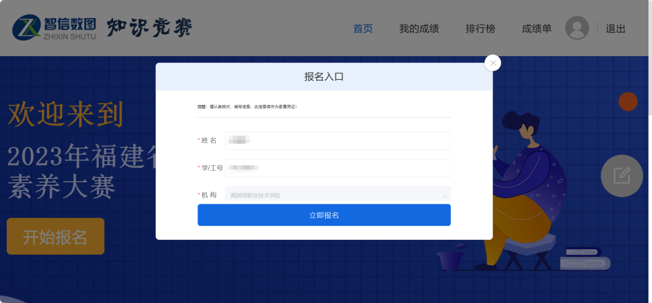 STEP2:如有未注册的同学,可点击【立即注册】。在注册页面,选择机构:【湄洲湾职业技术学院】,根据提示输入信息,完成账号注册。注册成功后,使用该账号登录平台。登录平台后,系统会自动弹出报名信息,或者点击【开始报名】,根据提示填写信息,即可完成赛事报名。参赛选手即日起可注册报名,按要求填写完整信息。