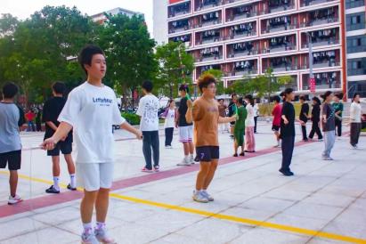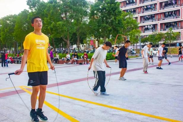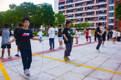 饱满的哨声吹响,一片打地声和从起跳声四面八方响起,是参加单摇跳的同学们在奋力跳绳,紧张而又急促的节奏,环绕湄园。连贯急速的起跳,宛如脱兔般轻盈的身姿,他们笑着,跳着,挥洒着青春的汗水!