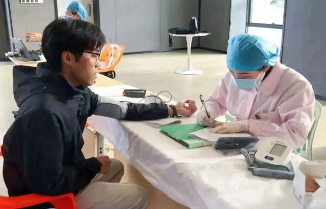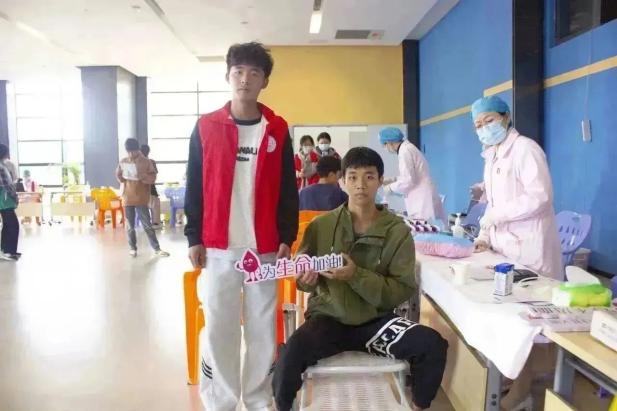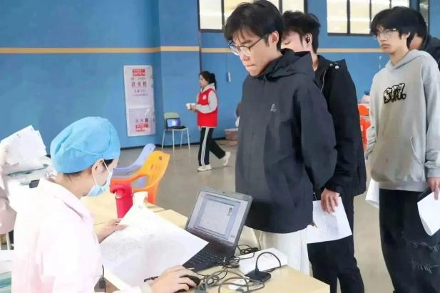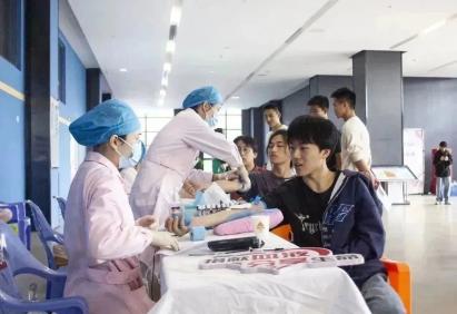 献血开始前,志愿者引导同学们签到,并领取表格填写个人信息,同时安排同学们有序排队等待。