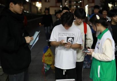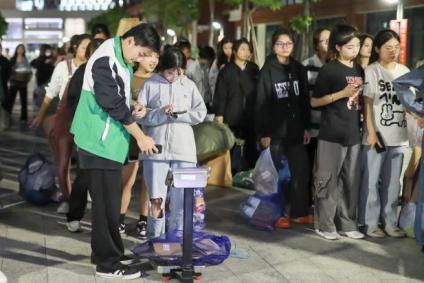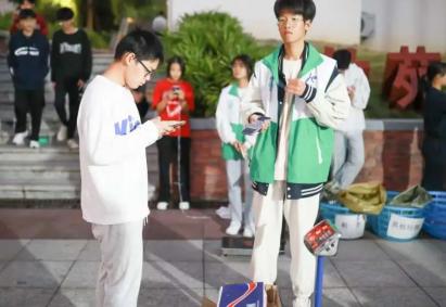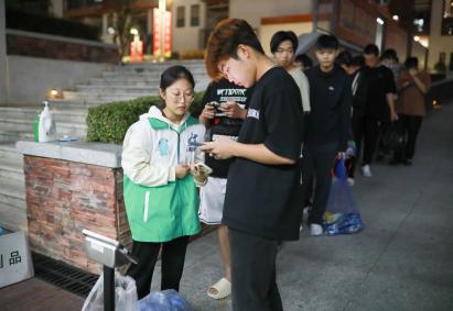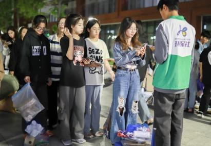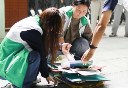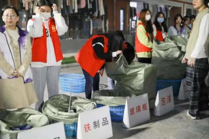 志愿者们分工协作,回收着各类垃圾,同学们也十分配合的排好了队将废品称重,并且将垃圾放到指定的袋子里。