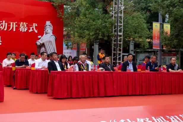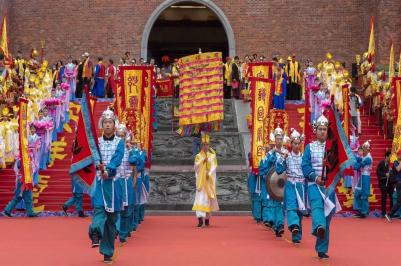 懿明楼及其广场,五星红旗高高飘扬,“世界和平、祖国和昌、社会和谐、民族和睦、两岸和合、家庭和美”等垂幅标语,悬挂于懿明楼两旁。36名司礼生环场高举妈祖36次历代朝廷的褒封圣旨牌,现场气氛热烈而隆重。