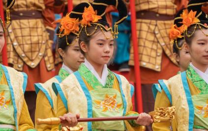 大典开始,随着通赞主持,仪卫队、仪仗队就位,清道旗、鸣锣开道,警跸牌从观礼台并列两侧拾级而上,进入主祭区。仪仗队步行至懿明楼大门前就位,封号旗、提灯、提炉分别就位。随后,由我院学生献上历经半个月艰辛训练的“三献之舞”,和谐呼应、花开并蒂。舞生身着汉代服饰,舞蹈语汇表达妈祖舍身济难,慈海护航的内涵。