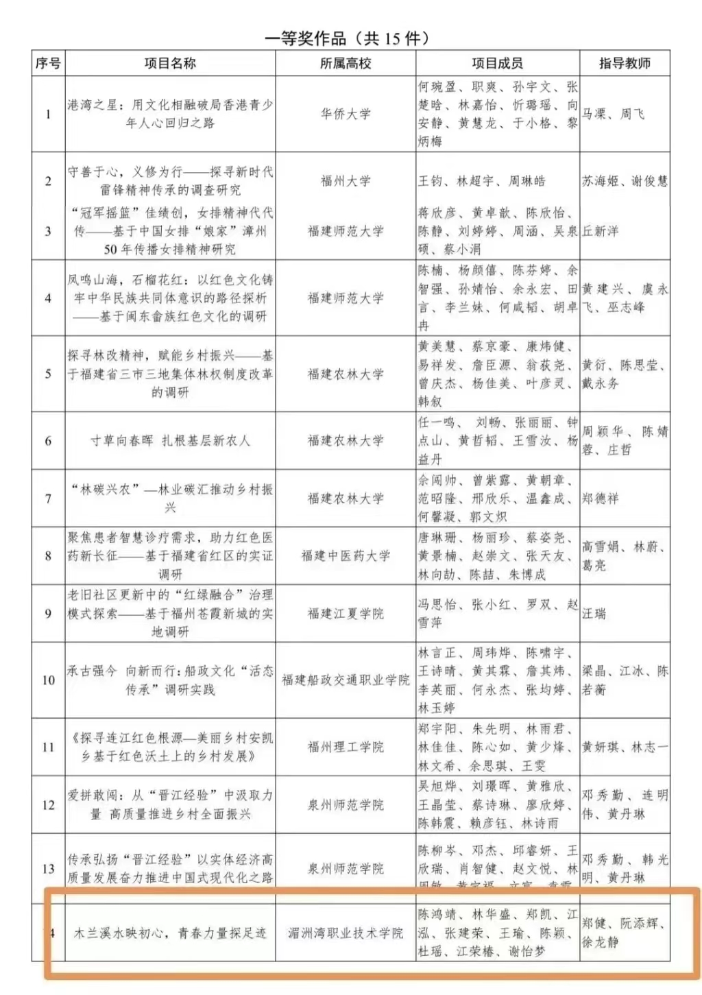 日前,由共青团福建省委、省科学技术协会、省教育厅、福建社会科学院、省学生联合会主办的第十六届“挑战杯”福建省大学生课外学术科技作品竞赛“红色专项”活动获奖名单公示,我校选送的项目《木兰溪水映初心,青春力量探足迹》(项目成员:陈鸿靖、林华盛、郑凯、江泓、张建荣、王瑜、陈颖、杜瑶、江荣椿、谢怡梦,指导老师:郑健、阮添辉、徐龙静)荣获省赛一等奖。