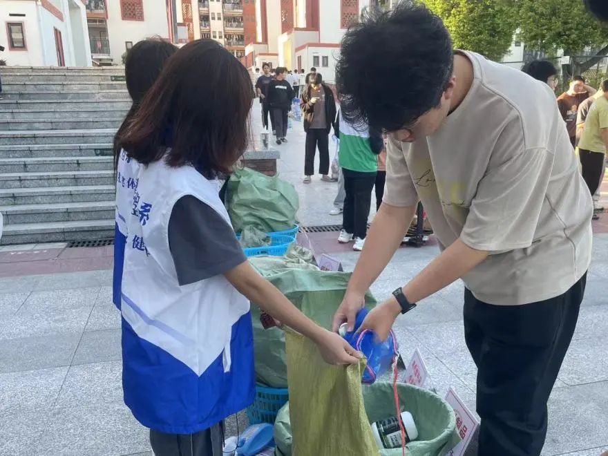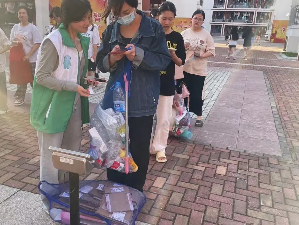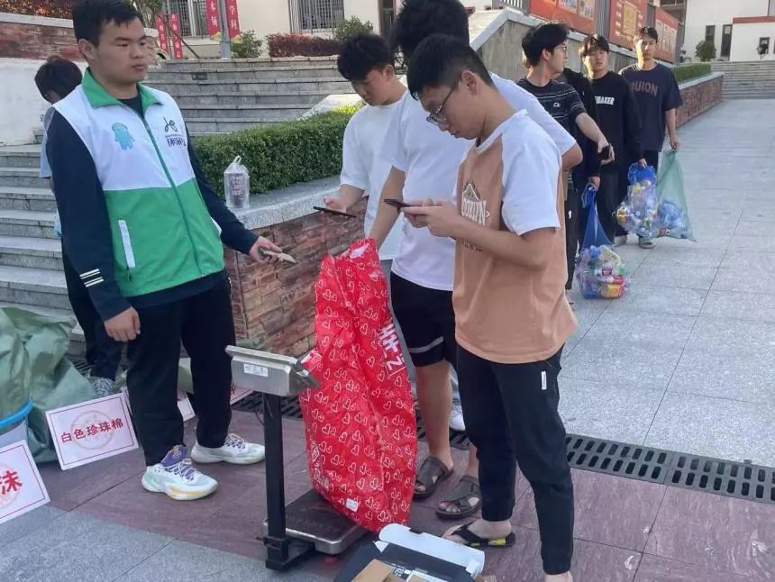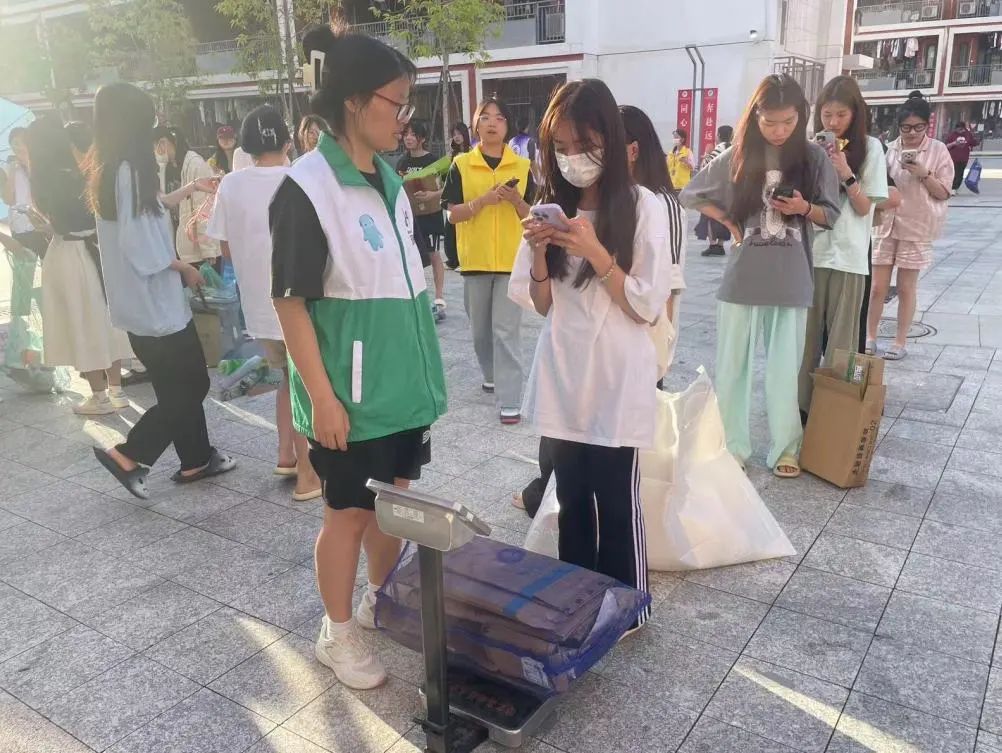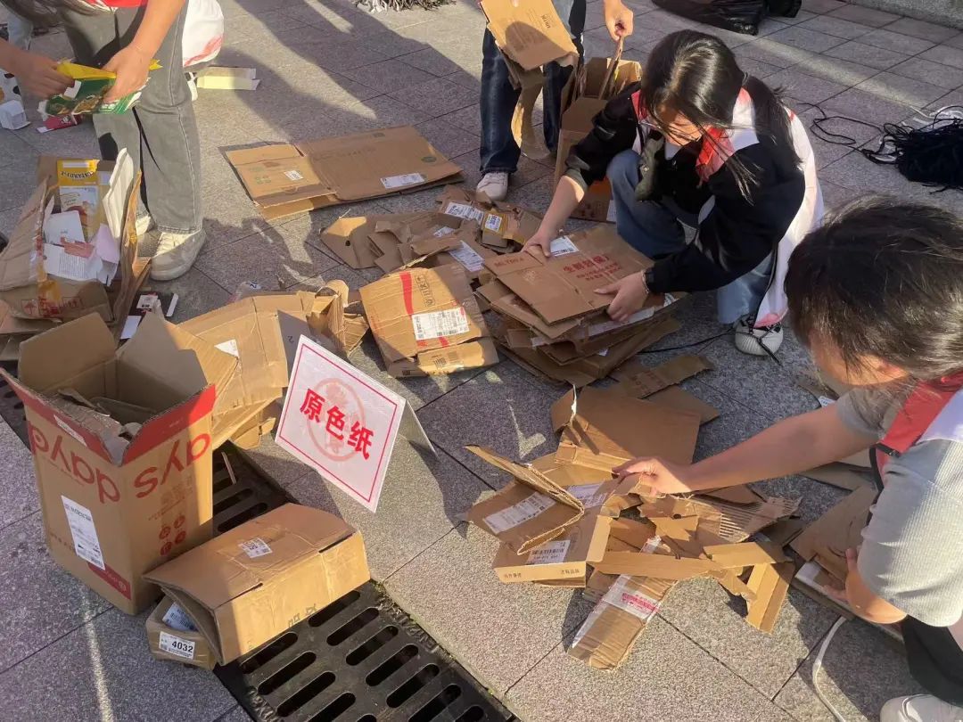 活动现场志愿者们耐心讲解垃圾分类有关知识,给学生现场微信扫码登记。在现场,同学们将冲洗好的饮料瓶踩扁,盖子和瓶身分开,快递盒摊开折平,快递信息撕掉,再拿下来。志愿者有条不紊地对垃圾进行分类、包装、捆绑,并积极引导同学们正确投放不同的垃圾类别。