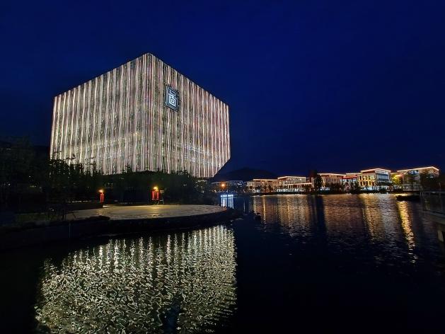 湖畔上的图书馆在夜色里有着方格式的明亮