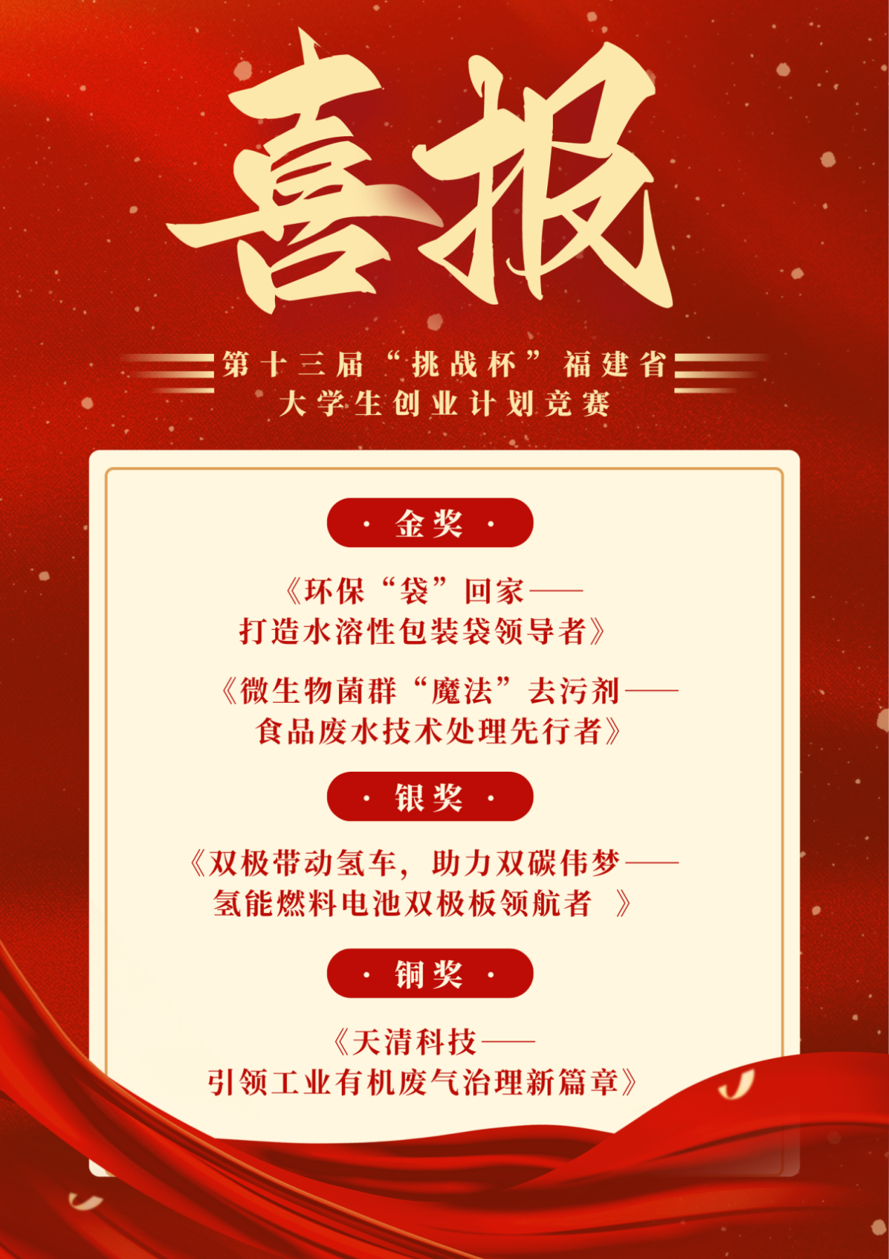 星光不负赶路人,天道酬勤佳音来。根据《关于组织开展第十三届“挑战杯”福建省大学生创业计划竞赛的通知》,6月10日由团省委、省教育厅、省人社厅、省科协、省学联联合举办的第十三届“挑战杯”福建省大学生创业计划竞赛落下帷幕。经大赛组委会资格审查,网络初评,大赛评审委员会复评,终审决赛评审等环节,评出普通高校组金奖40个、银奖60个、铜奖104个;职业院校组金奖20个、银奖30个、铜奖51个;第十三届“挑战杯”福建省大学生创业计划竞赛优秀台湾创业青年项目27个。