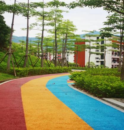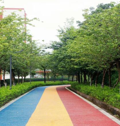 在树林里,有一片蜿蜒曲折的彩虹步道。平稳坦荡的路面,刷上五颜六色的彩虹油漆,漫步其中,头顶上摇曳生姿的枝丫沙沙,脚下是缤纷的道路,午后蝉鸣,是不一样的情与景。