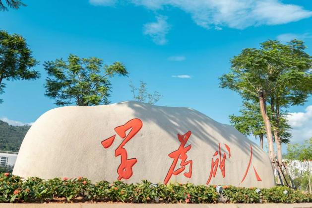 校门往里五十米,两旁郁郁葱葱的树木尽头,苍劲有力地镌刻着四个红漆大字:学为成人!不仅是湄园的标志,更是湄园对学子们的期望。