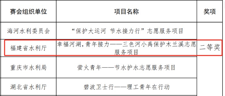 日前,水利部宣讲教育中心、团中央青年志愿者指导中心中公布了第七届全国节水护水志愿服务暨水利公益宣传教育专项赛评选结果,湄洲湾职业技术学院“幸福河湖,青年接力——三色河小禹保护木兰溪志愿服务项目”荣获二等奖。据悉,该项目由福建省水利部直接推荐参加全国比赛,经报告提交、路演材料提交、专家提问等环节,从全国各省推荐的135个项目中脱颖而出,获得该奖项。接推荐参加全国比赛,经报告提交、路演材料提交、专家提问等环节,从全国各省推荐的135个项目中脱颖而出,获得该奖项。