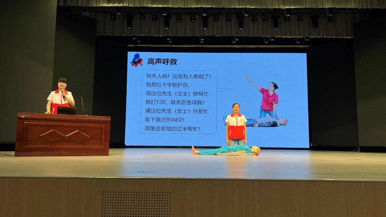 罗阳老师以讲授和现场实操的形式讲解了红十字运动起源标志、主要纪念日、红十字事业、基本原则以及“黄金抢救4分钟”和心肺复苏的重要意义。为了巩固学习效果,林瑜老师结合现实案例对心肺复苏的操作流程、心肺复苏 (CPR)、自动体外除颤器 (AED)、气道异物堵塞急救和常见突发事件现场救护等进行详细实操演练。