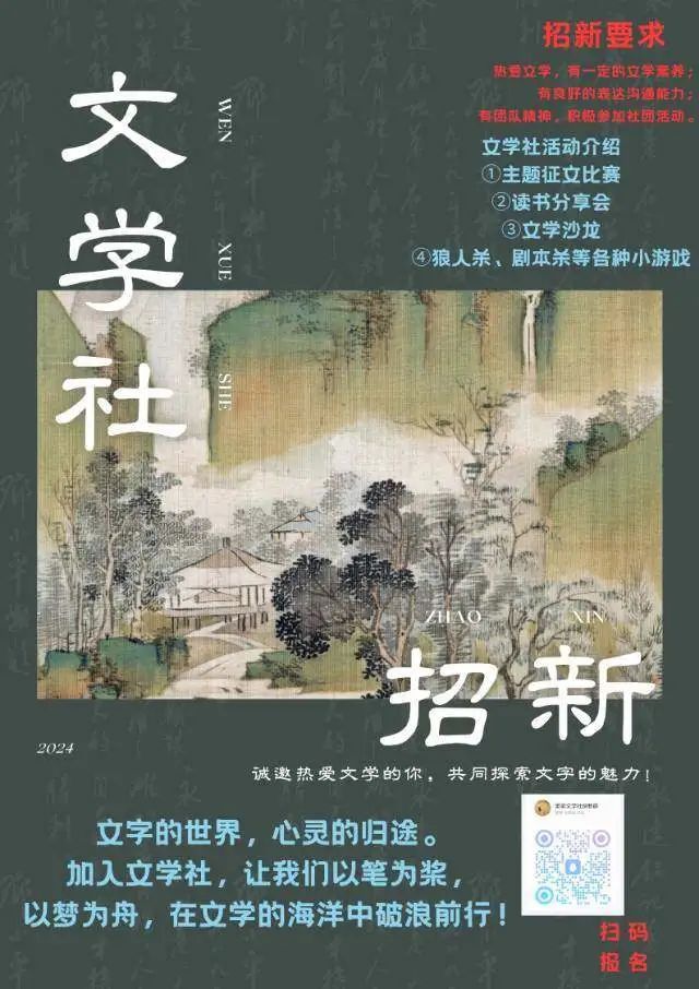 文学社作为校园文化的重要组成部分,是文学爱好者展示才华的舞台。在这里,我们一同感受文字的魅力,挥洒创作的激情。加入文学社,点燃心中的文学梦想。在这里,你将找到施展才华的空间,与我们一起创造属于未来的精彩篇章。在文学社,以文会友,以墨传情。与更多热爱文学的人相识相知,共同探索文字的奥秘,传递真挚的情感。