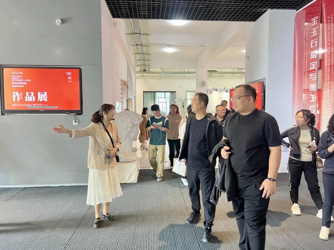 访问团一行首先抵达学院工艺美术系艺术馆,馆内陈列的各类精美作品令人应接不暇、赞叹不已。传统的木雕散发着古朴醇厚的韵味,陶艺作品展现出细腻与灵动之美,漆艺则闪耀着神秘而绚烂的光彩;现代的皮具设计时尚大气,珠宝玉石设计璀璨夺目,每一件作品都充分彰显着工艺美术大师的非凡匠心与独特创意。