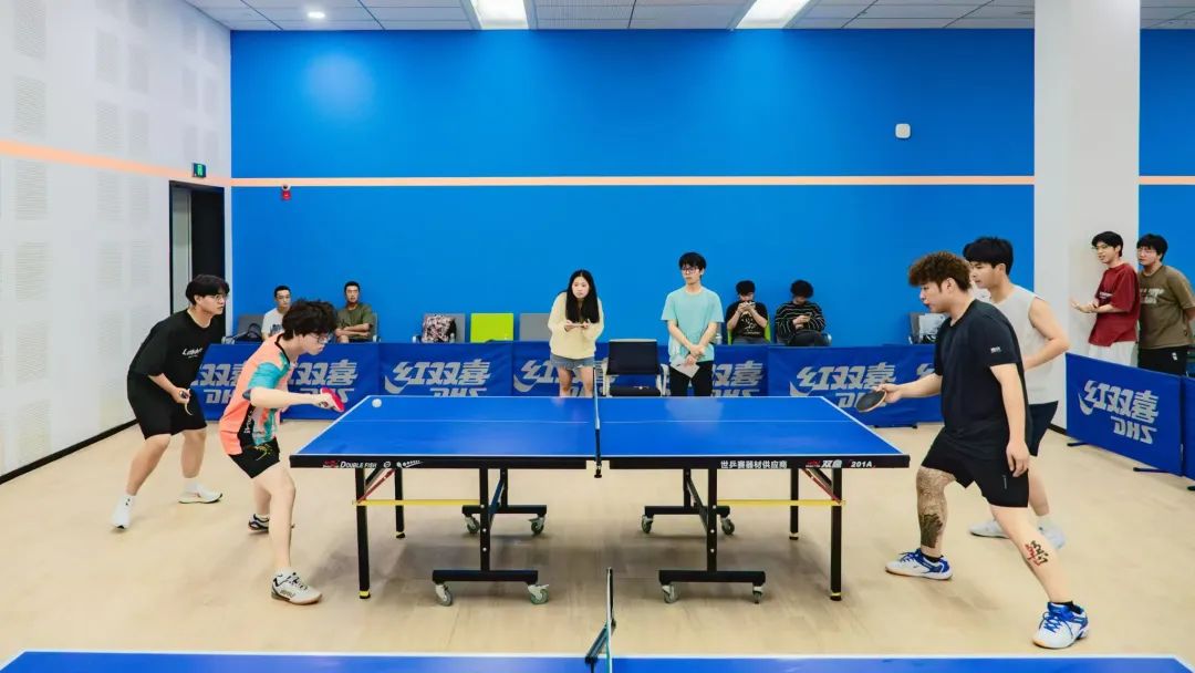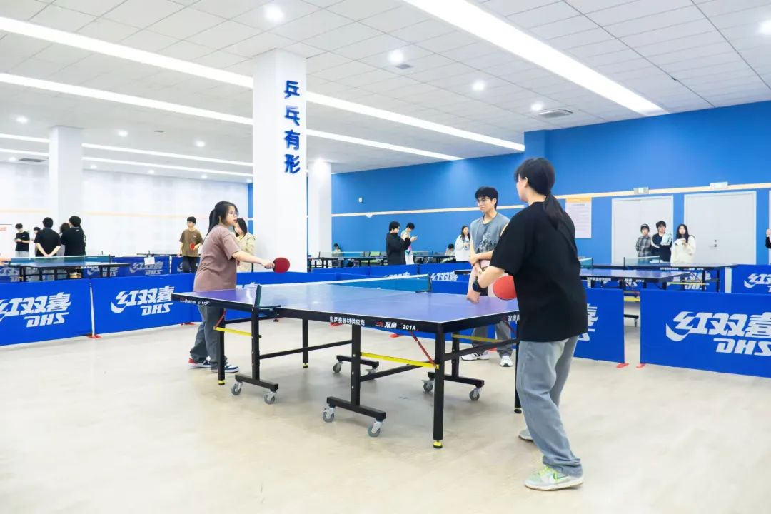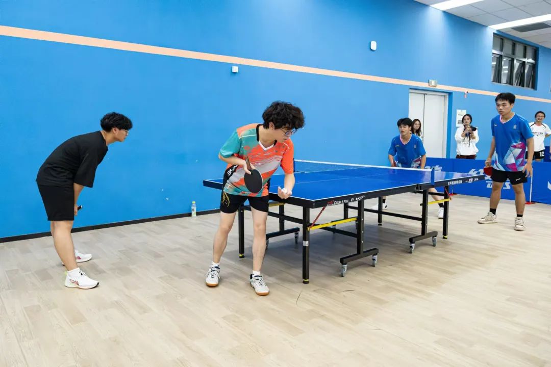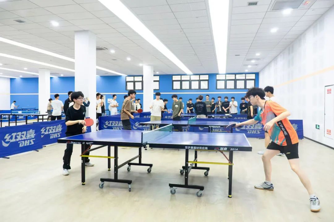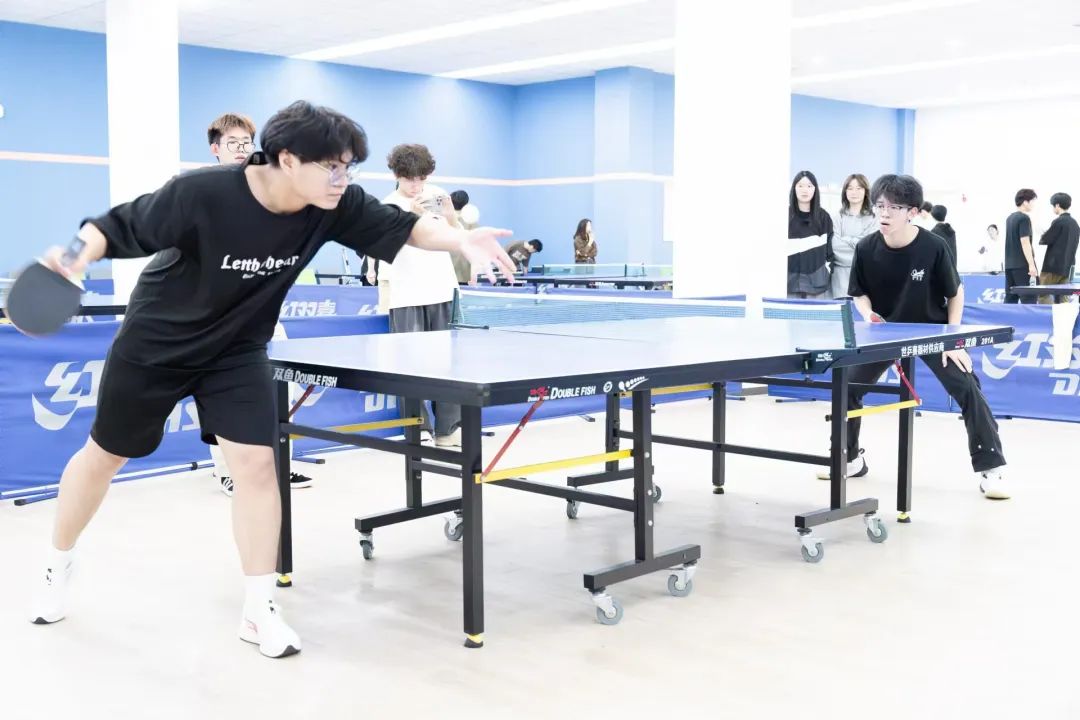 判断球的落点,瞬间做出决策,双方选手凭借精湛的个人技艺和默契的团队配合,多次上演快攻得分、巧妙发球等精彩瞬间,攻防转换迅速,比赛节奏紧凑,速度与技巧在每一次交锋中完美展现。这是乒乓球选手的一门默契和智慧,每一个回合都是他们战斗的见证,每一次精准的扣杀、每一次巧妙的发球,都赢得了观众席上如潮般的掌声,观战的同学们情绪高涨,不断为自己支持的队伍呐喊助威,加油声、欢呼声此起彼伏,整个赛场沉浸在一片热烈而紧张的氛围之中。