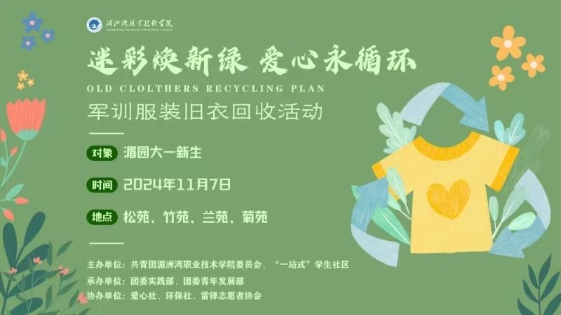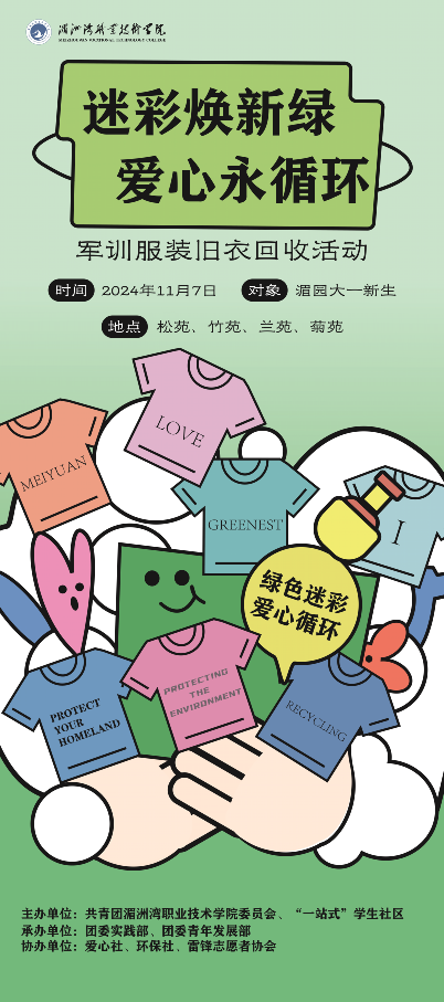为此,学院团委携手“一站式”学生社区,联合团委实践部、团委青年发展部,以及爱心社、环保社、雷锋志愿者协会等组织,共同发起“迷彩焕新绿,爱心永循环”军训服装回收活动。我们诚挚邀请每一位曾身着迷彩、挥洒热血的你,与我们一同为环保事业贡献自己的力量。