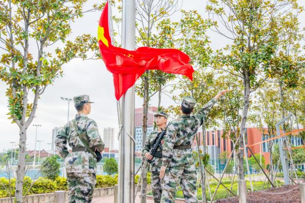 国旗手们气宇轩昂,步伐豪迈整齐,以青春之姿捍卫国旗威严。伴随着雄壮的国歌奏响,五星红旗在微风的轻拂下冉冉升起,全院师生肃立面向国旗庄严敬礼。