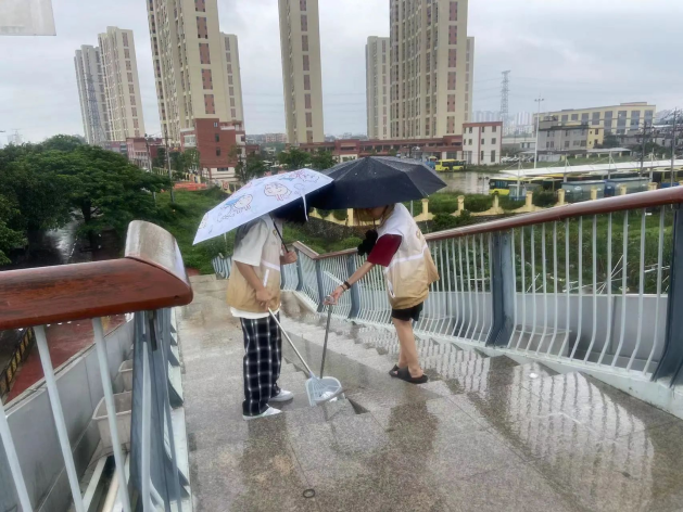 每一次志愿活动的组织都得到了工商学子们的大力支持,大家总是以饱满的热情和强烈的责任感投身其中,他们风雨无阻,不管是烈日晴天还是下雨都能看到他们的身影。他们在每次开展志愿服务活动前都会进行精细的分工布置,积极发挥团队协作,对天桥的每一个角落进行全面而细致的清洁,无论是桥面、桥栏还是扶手,在志愿者们的努力下焕发出新的光彩。这份坚持与努力,彰显了他们的青春活力,更体现了对美丽湄园的深切期盼。