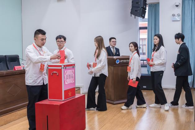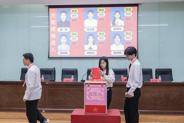 学生代表们将手中宝贵的一票有序放入投票箱中。