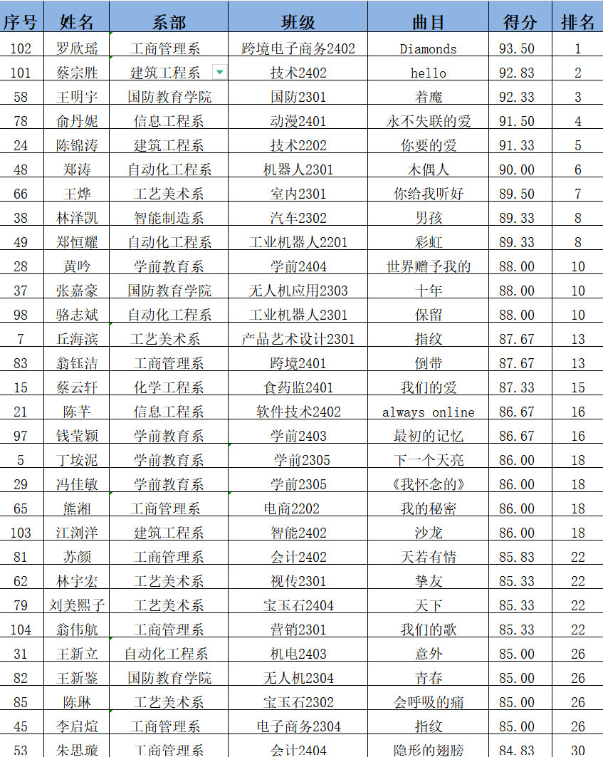 在十佳的天地里,律动是梦想的画笔,旋律是憧憬的轮廓。每一首歌曲,都承载着同学们对音乐的理解与追求。经过激烈角逐,十佳歌手大赛的海选环节落下帷幕让我们一同揭晓此次海选的晋级名单,看看哪些同学用歌喉描绘出了令人心动的精彩世界。