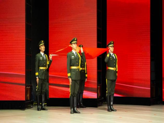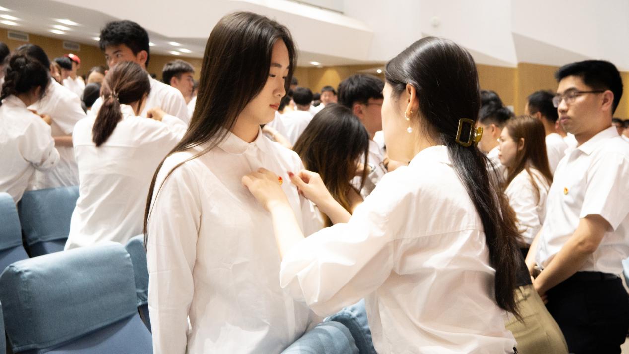仪式在庄严的国歌声中拉开帷幕。国防教育学院学生主持人王伟,宣读新团员名单。随后,现场举行了隆重的佩戴团徽和发放团员证仪式,学院领导林新钊、张凡为 10 位新团员代表佩戴团徽、颁发团员证,台下,学院部门负责人、各系书记、分团委负责人和老团员共同为新团员佩戴团徽并颁发团员证,一枚枚团徽在胸前闪耀,象征着责任与使命的传递。
