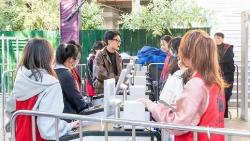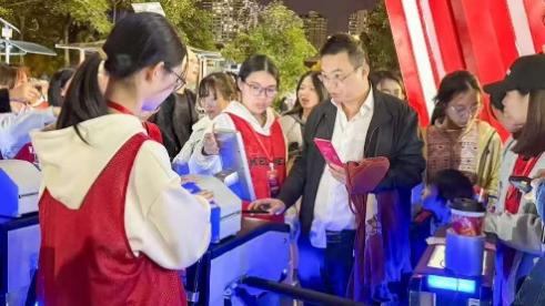 检票口前,志愿者们身着统一志愿服装,神情专注而耐心。他们熟练地接过入场凭证,快速核对信息、撕票或扫码,动作利落却不失温和,尽量缩短观众的等候时间。遇到不懂操作电子票的观众,他们会俯身细致讲解;面对着急入场的人群,他们始终保持微笑,轻声引导“请大家排好队,依次检票,不要着急”,用专业态度筑牢活动入场的第一道防线。
