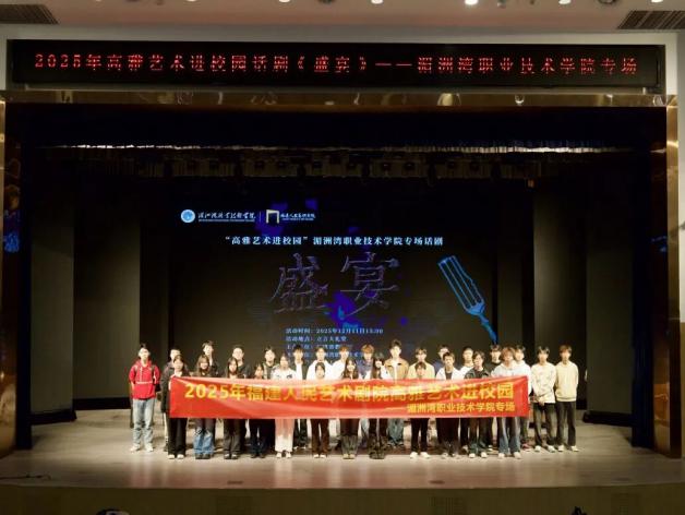为深入推进美育工作改革,12月11日,湄洲湾职业技术学院携手福建人民艺术剧院,将经典话剧《盛宴》搬入立言大礼堂,这场兼具思想性与艺术性的话剧演出,成为学院以美育人、以文化人的生动实践,为师生们带来了一场沉浸式的美育盛宴。
